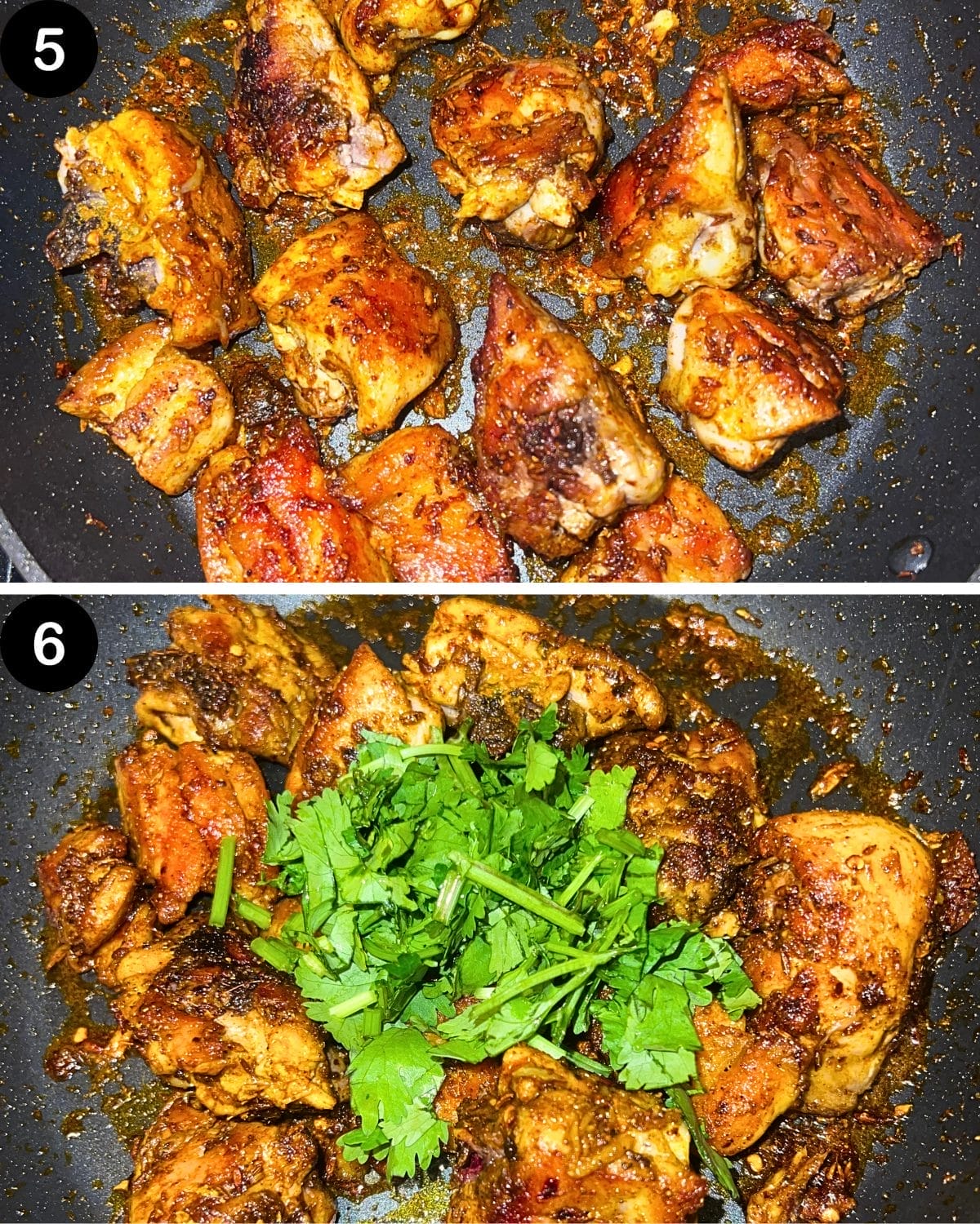- Once the cumin seeds change color, add chicken. Stir fry the chicken for another 10-15 minutes on medium-high heat until it turns golden brown.1 lb chicken thigh